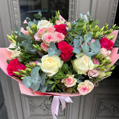 Elegant flower bouquet made of 9 roses, 5 bush roses, 3 eustoma, 9 pistachio branches, 0.5 bunch of eucalyptus. Decorative packaging and satin ribbon.