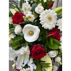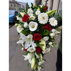 Klasisks bēru štrauss baltos un sarkanos toņos, veidots XL izmēra floretē ar oāzi. Štrauss darināts no svaigiem ziediem un harmoniski saskaņotiem zaļumiem.