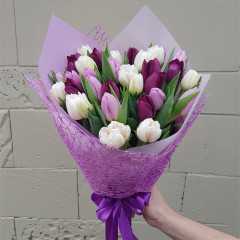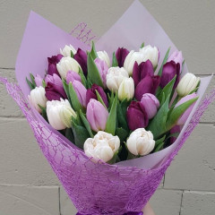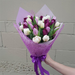 Bouquet of white and purple tulips in a decorative package. There are 21 tulips in the bouquet, if you want you can increase the number of flowers in the bouquet.