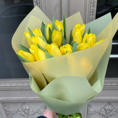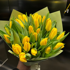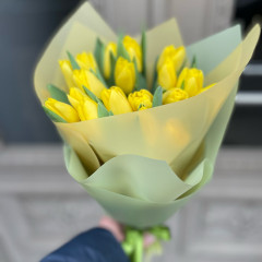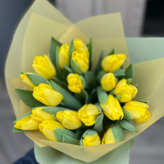 Букет желтых тюльпанов в декоративной упаковке, букет состоит из 21 желтого тюльпана, декоративной упаковки, атласной ленты и бесплатной поздравительной открытки.