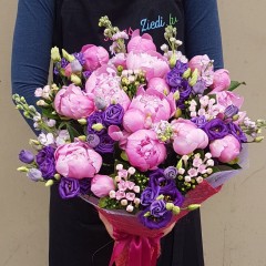 Burvīgi smaržojošs rozā peoniju, lizanšu un lefkoju pušķis, dekoratīvā iepakojumā. Pušķī iespējams mainīt ziedu skaitu, minimālais skaits sākot no 11 ziediem, kam papildus pievienoti dekoratīvie augi, kas tajā brīdī pieejami. Papildus pievienosim bezmaksas apsveikuma kartīti.