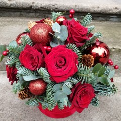 Krāšņš apsveikums šajā svētku laikā. Kompozīcija ar rozēm, egļu zariņiem, čiekuriem un eglīšu rotājumiem.