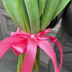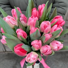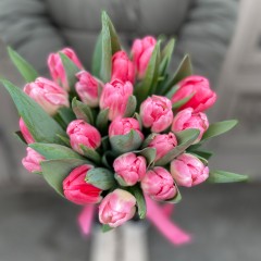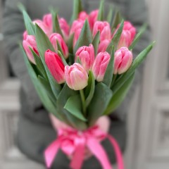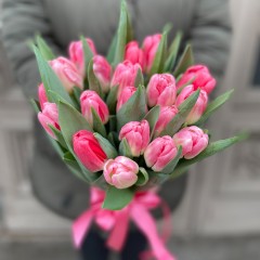 Pink tulip bouquet. Bouquet of 21 tulips. The composition and appearance of the flower bouquet may change slightly if one of the flower varieties shown in the depiction is not available during the season, it will be replaced by the similar. The main guidelines for flower bouquet design will be preserved, both in appearance and in value.
