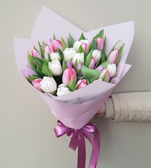 Букет из белых и розовых тюльпанов. Букет из 21 тюльпанов в декоративной упаковке.