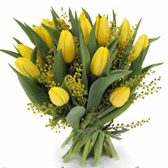 Uzmanību, pušķis piejams sākot no 06.marta. Dzeltenu tulpju pušķis ar mimozu, pušķī 19 tulpes un 3 zari mimoza.