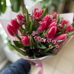 Tulpju pušķis ar vaska puķi dekoratīvā iepakojumā.