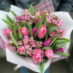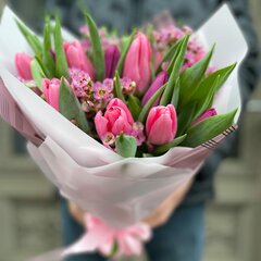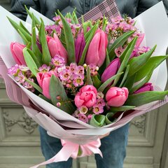 Sastāvs: 19 tulpes, 3 vaska puķe, dekoratīvais iepakojums