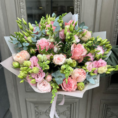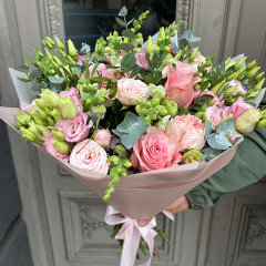 Ziedu pušķis veidots no 7 rozēm, 3 peonijveida krūmrozēm, 3 lizantēm, 5 lauvmutītēm un ½ buntes eikalipta. Kompozīciju papildina dekoratīvais papīrs un satīna lenta. Maigs, romantisks pušķis rozā un zaļganos toņos, kas simbolizē sirsnību un pateicību.