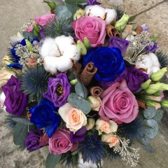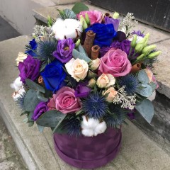 Ziedu kompozicija samta kastē ar rozēm, lizantēm, kokvilnu, kanēļa standziņām un eikaliptu.
